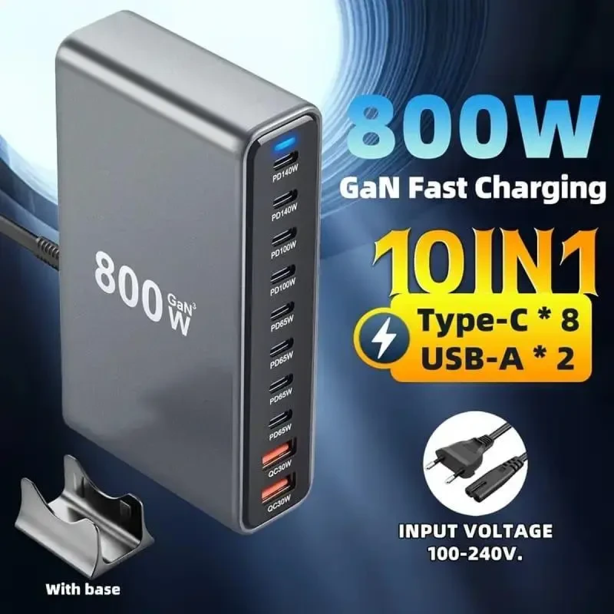 Зарядний пристрій 800W, GaN Pro PD 140W, QC 30W для телефонів, ноутбуків, 8портів USB+Type-C Чорний