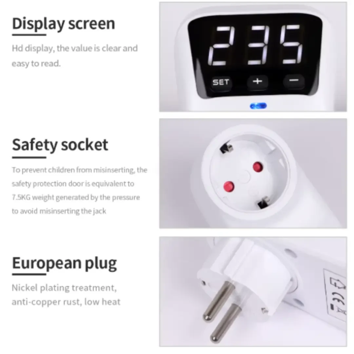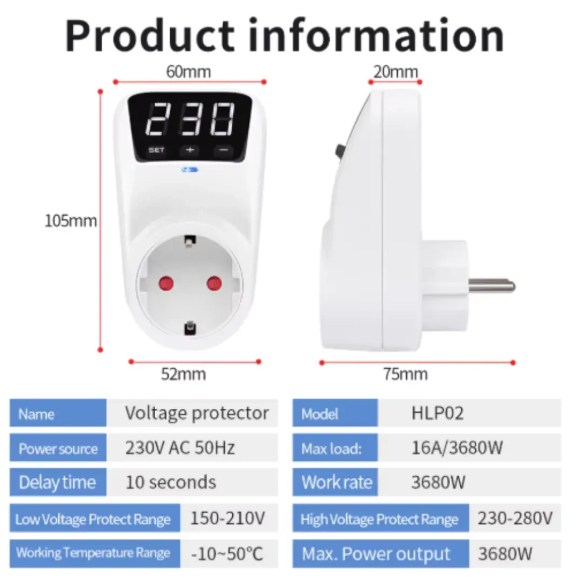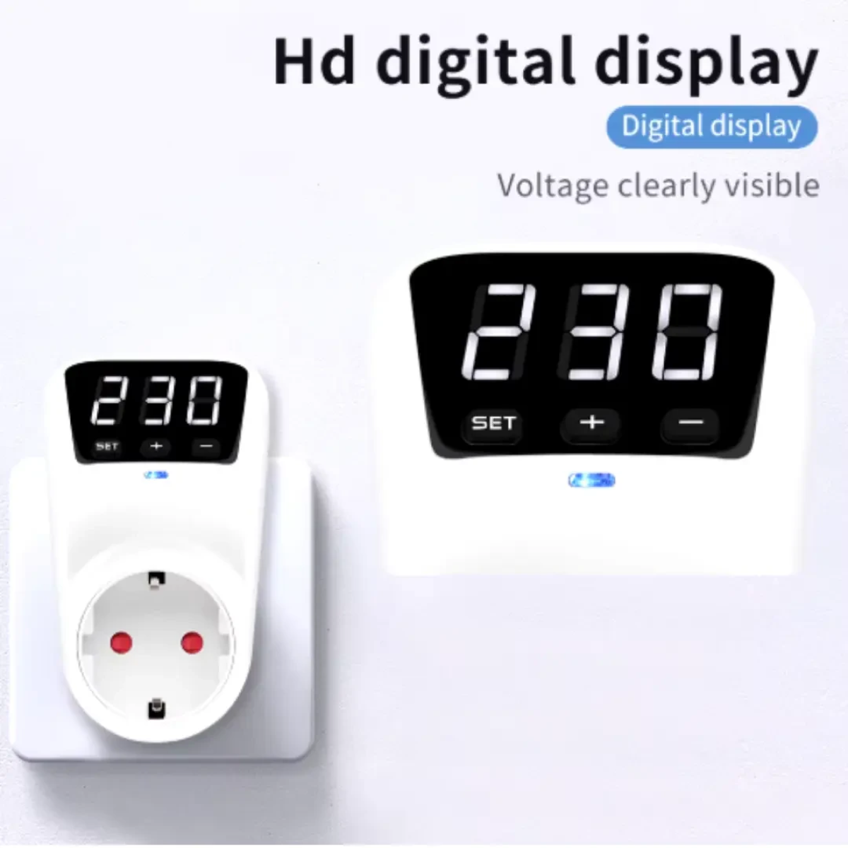 Розетка з регульованим обмеженням напруги, 16 А, автоматичний захист від перепадів напруги Практичний пристрій для безпечної роботи побутових приладів, який захищає їх від стрибків напруги в мережі. Ідеально підходить для дому або офісу, де важлива стабільність електроживлення. Характеристики Матеріал корпусу: пластик Тип роз’єму: розетка Робоча напруга: 230 В / 50 Гц Максимальний струм: 16 А Максимальна потужність: 3680 Вт Стан: новий Основні можливості Захист від перепадів напруги – автоматично контролює як високий, так і низький рівень (приблизно 170–270 В) Затримка включення – 10 секунд після відновлення живлення для уникнення різких навантажень Світлова індикація: синій – нормальна робота червоний – активовано захист Зручне налаштування – кнопки SET, “+” та “-” дозволяють легко виставити параметри Принцип роботи Підключіть пристрій до мережі та встановіть потрібні значення напруги і затримки. У разі небезпечних коливань напруги розетка автоматично відключає живлення. Після стабілізації мережі пристрій самостійно відновлює подачу електроенергії через 10 секунд. Технічні параметри Діапазон захисту від низької напруги: 150–210 В Діапазон захисту від високої напруги: 230–280 В Час затримки: 10 секунд Робоча температура: від -10°C до +50°C Це ефективне рішення для захисту техніки від нестабільної електромережі. Підключіть – і будьте впевнені у безпеці ваших приладів щодня.